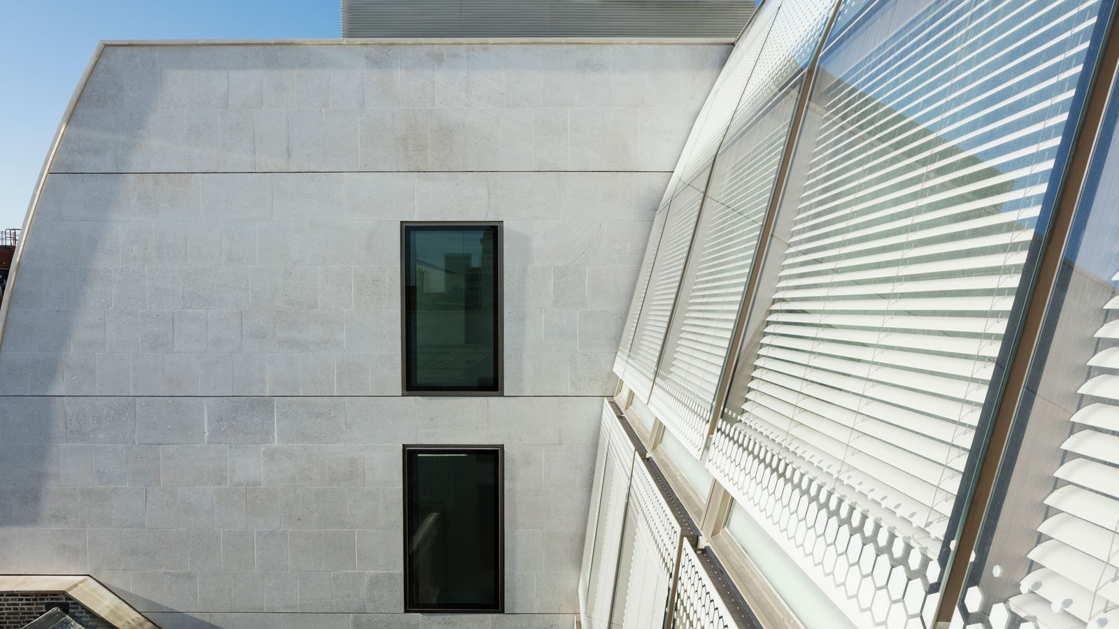 Facades of a modern building featuring sleek stone walls and large windows, with angled glass and shaded blinds reflecting the blue sky.